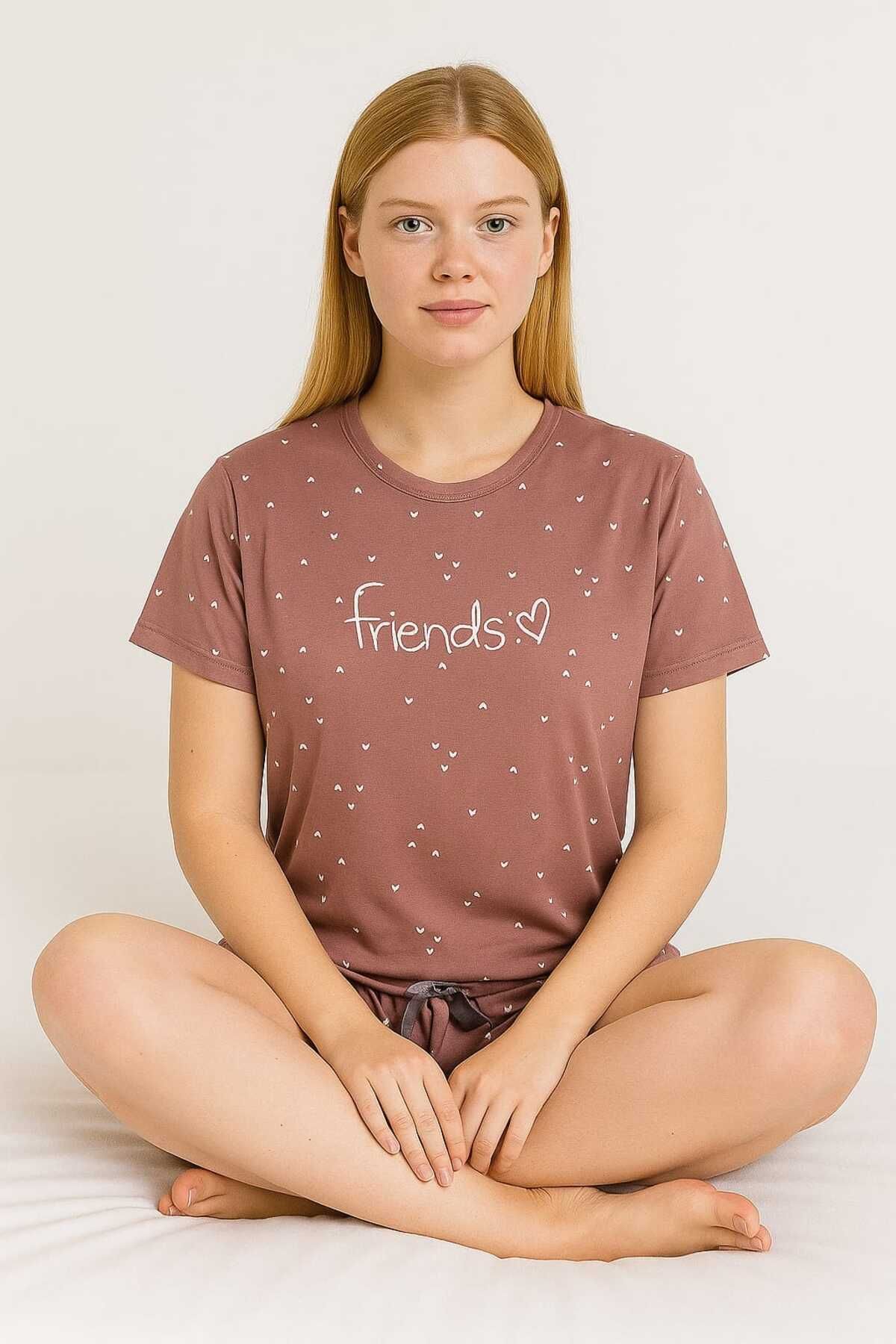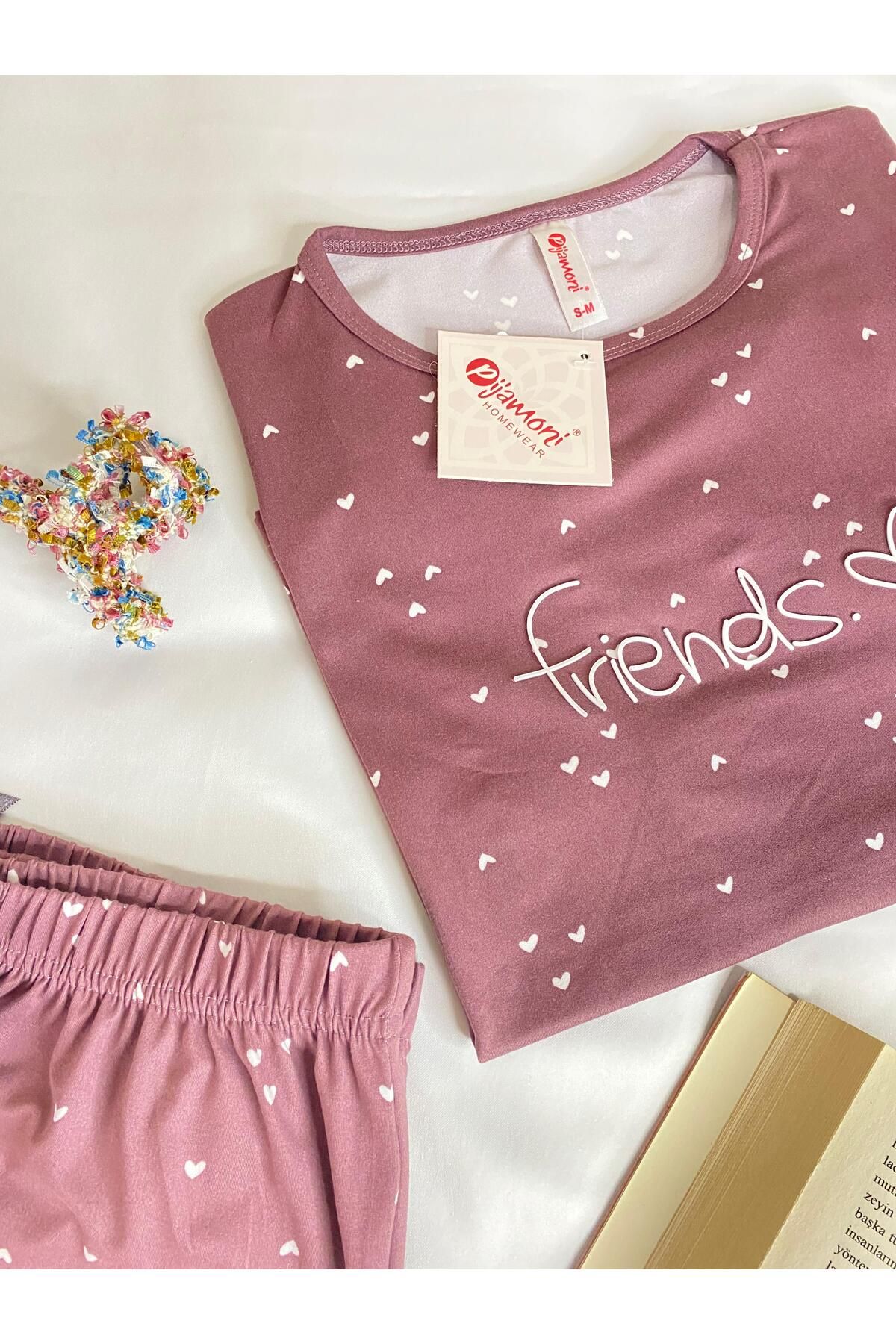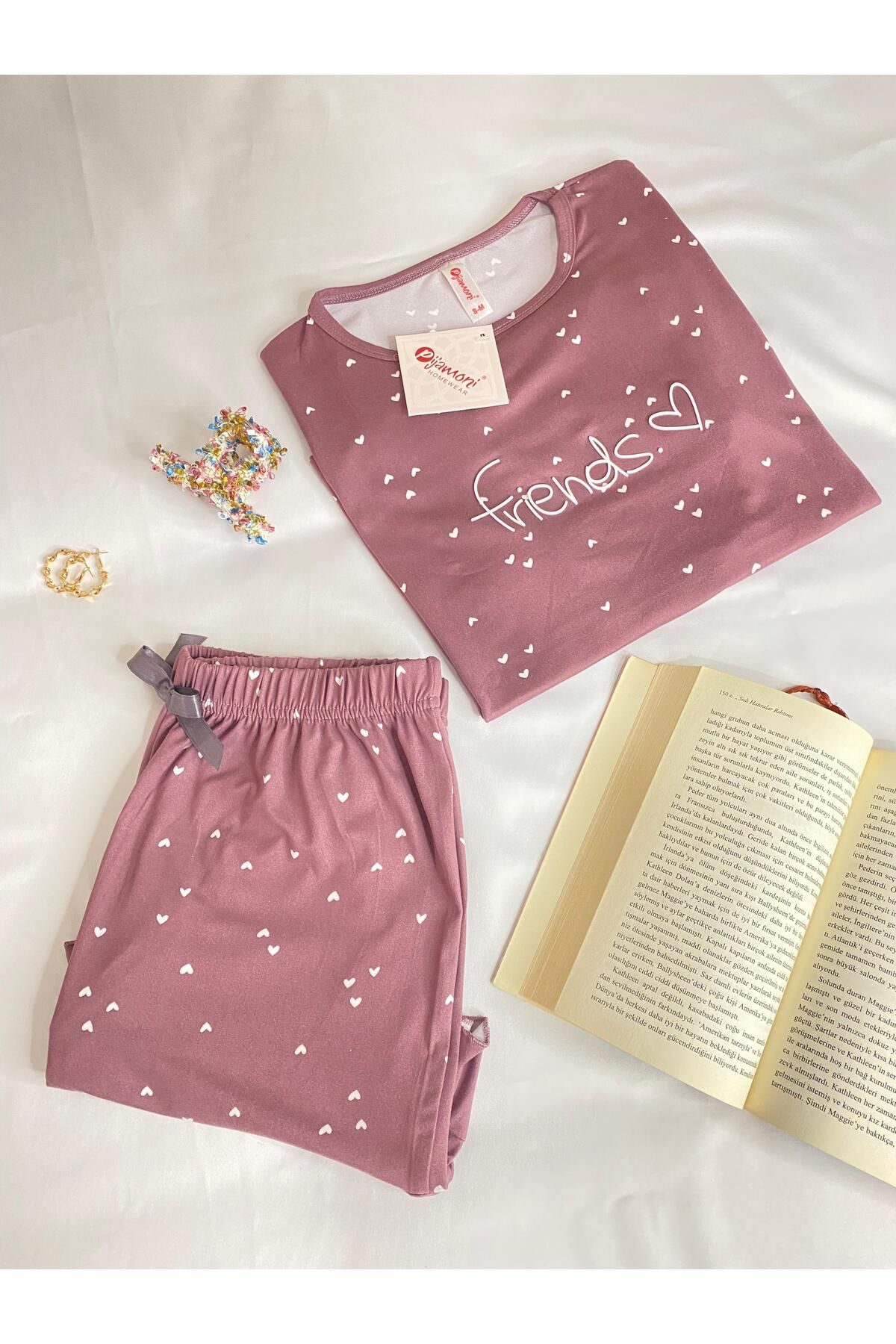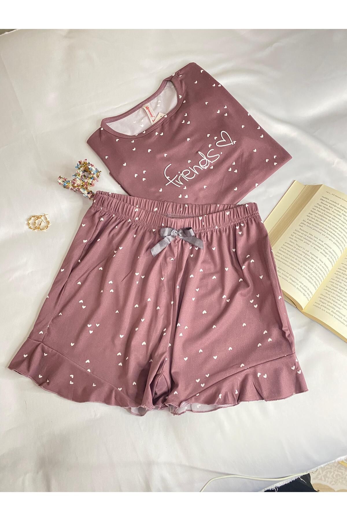 Kalp Desenli Gül Kurusu Renkli Kısa Kollu Şortlu Pijama Takımı